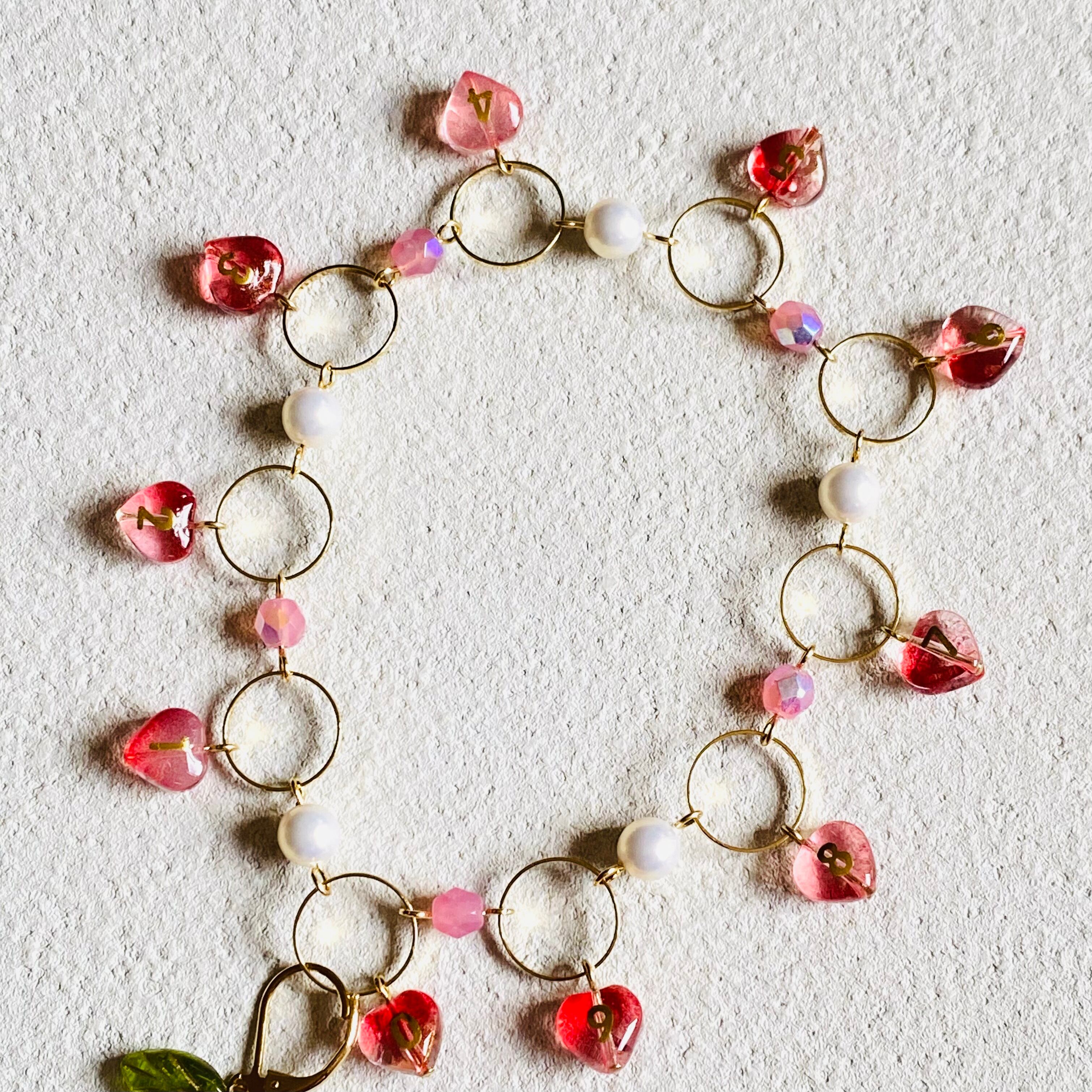 数字のビーズは一つ一つ手作業で数字のシールを貼りレジンコーティングしております。