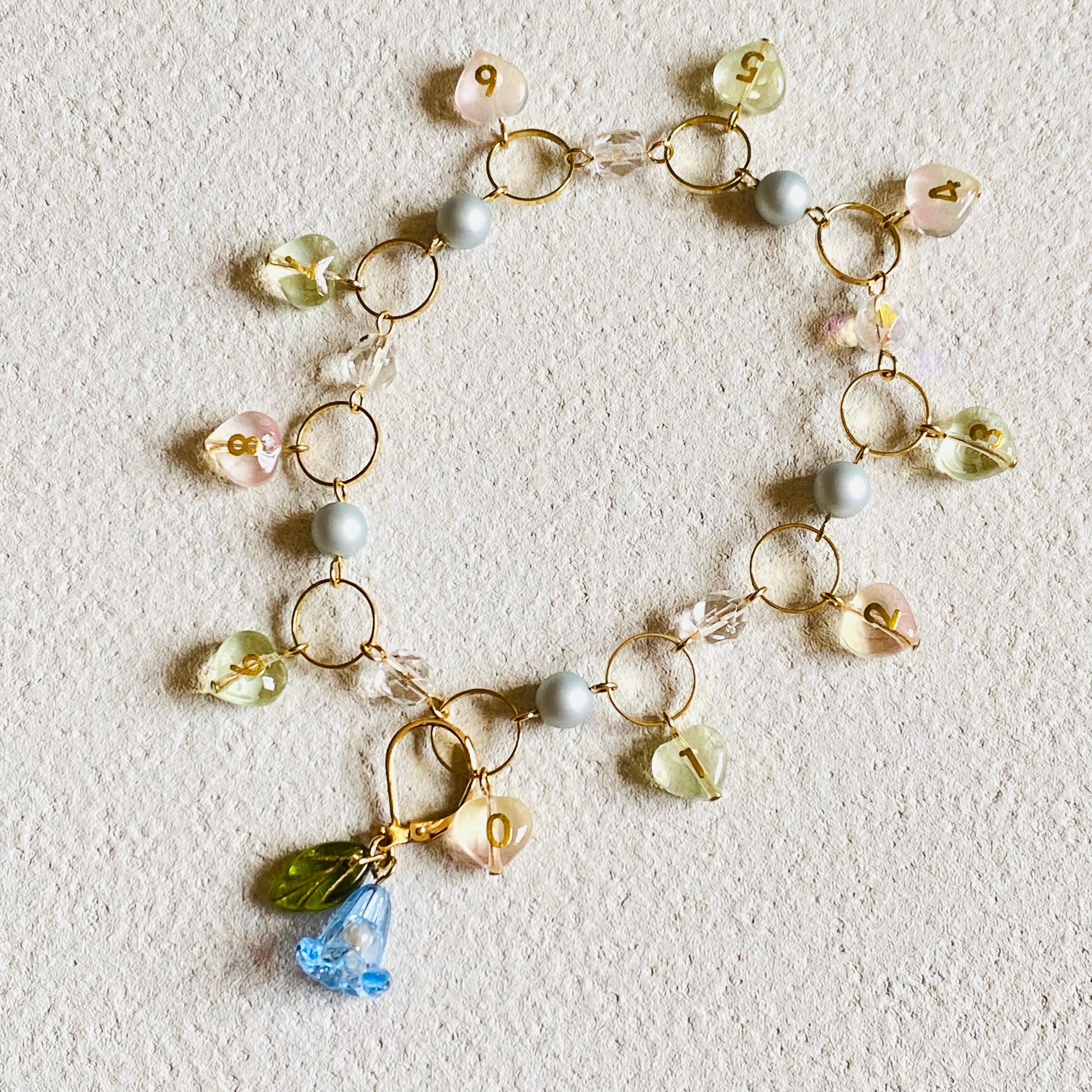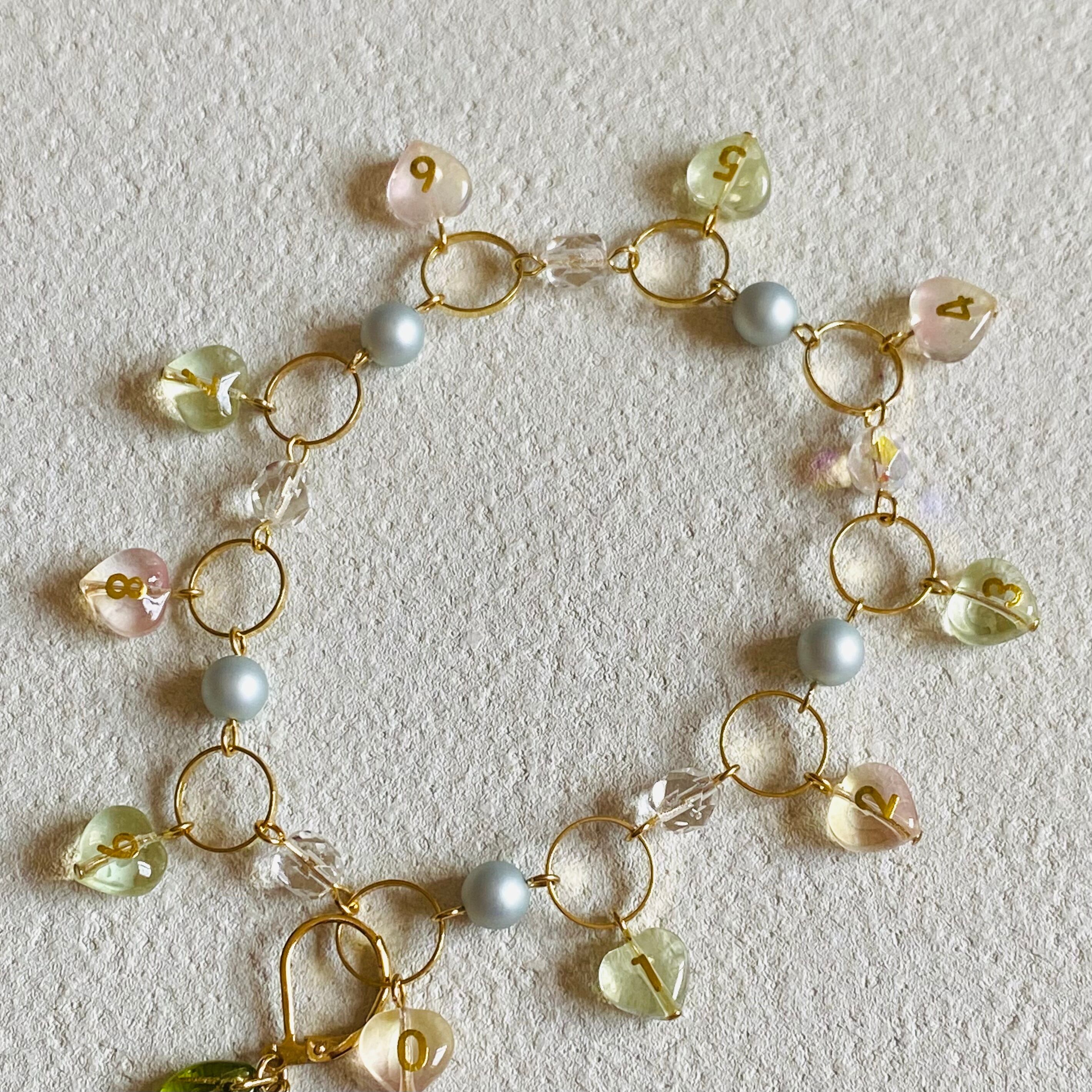 数字のビーズは一つ一つ手作業で数字のシールを貼りレジンコーティングしております。