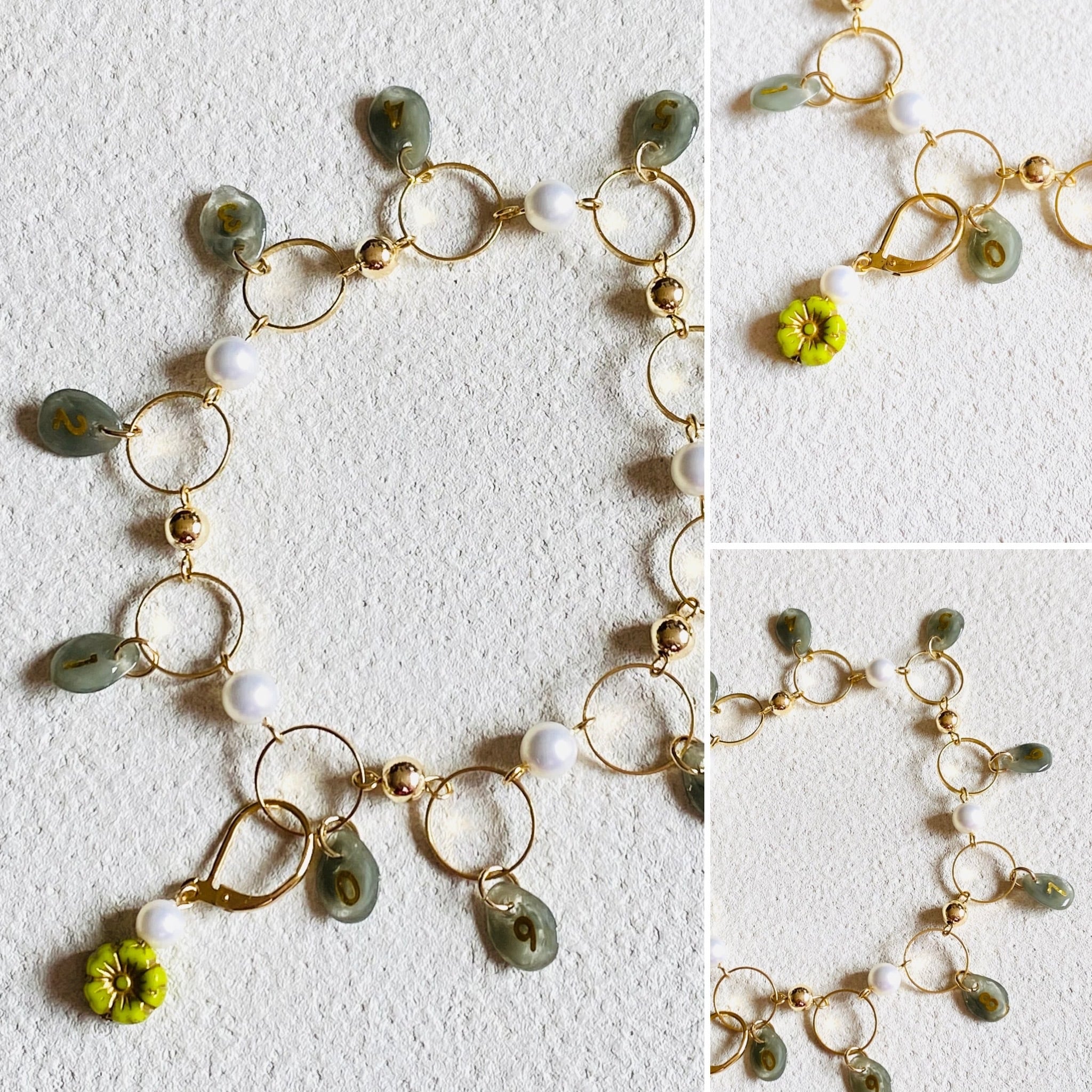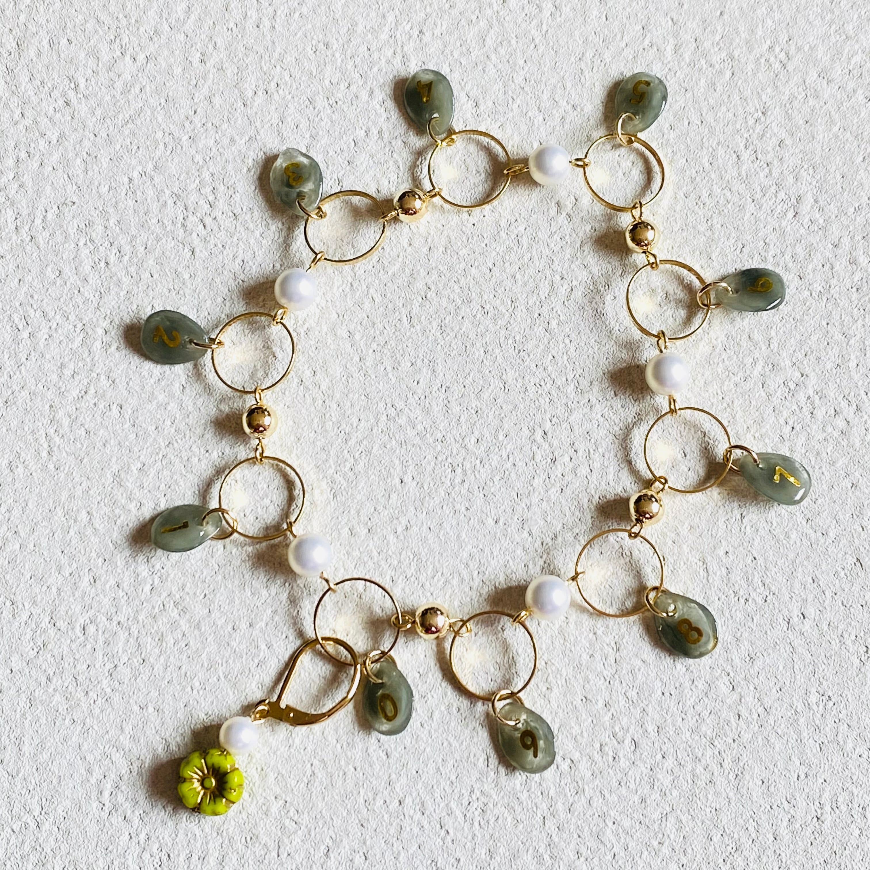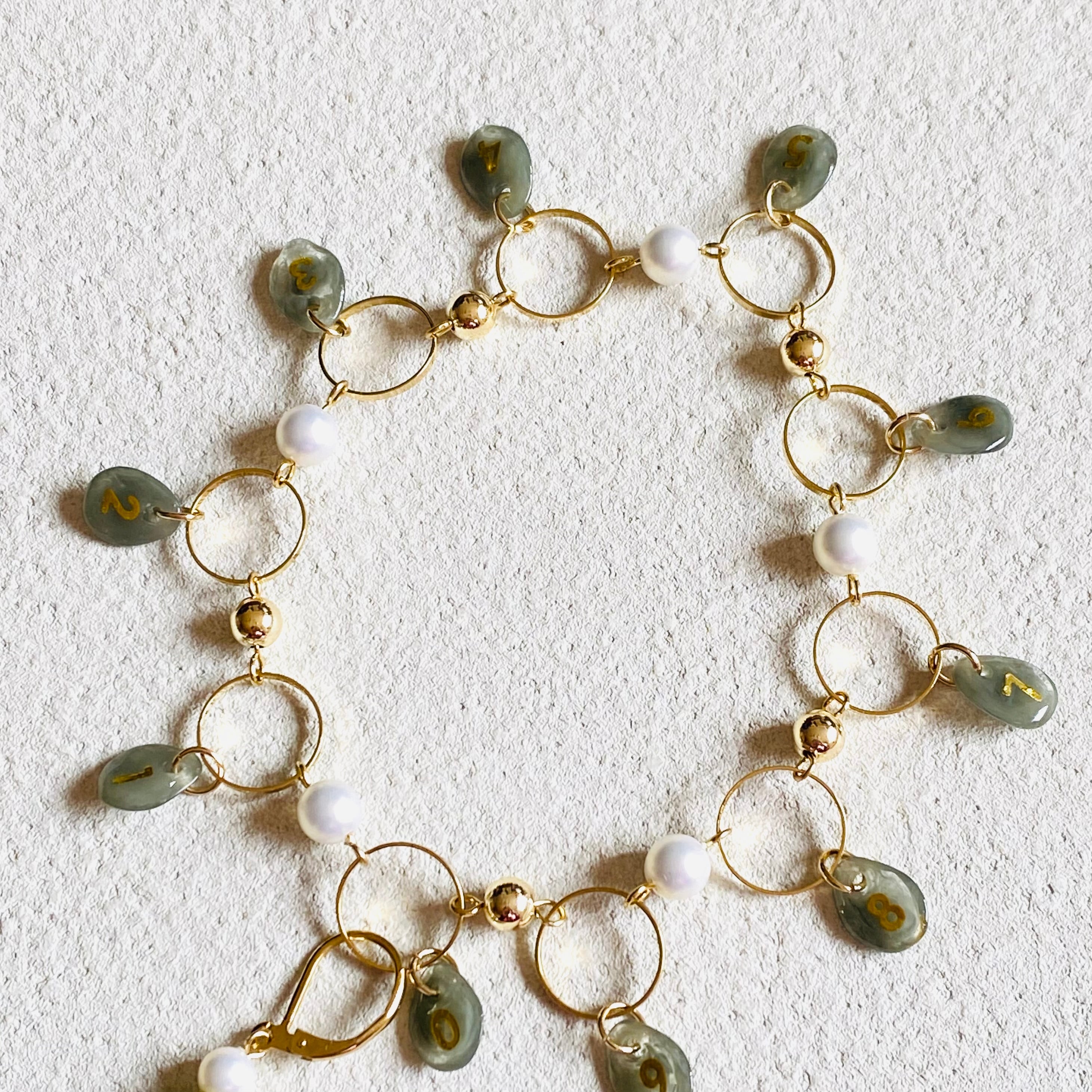 数字のビーズは一つ一つ手作業で数字のシールを貼りレジンコーティングしております。