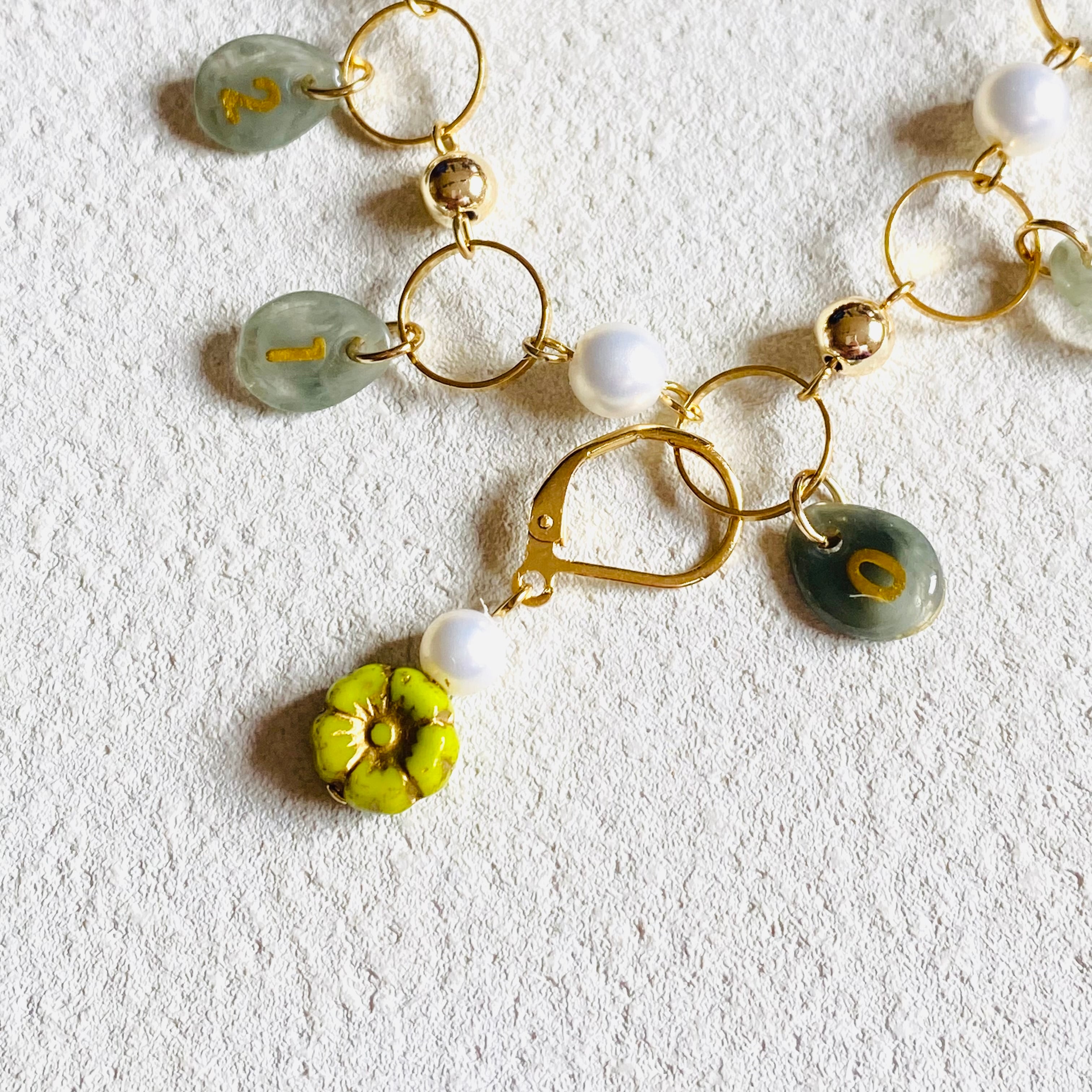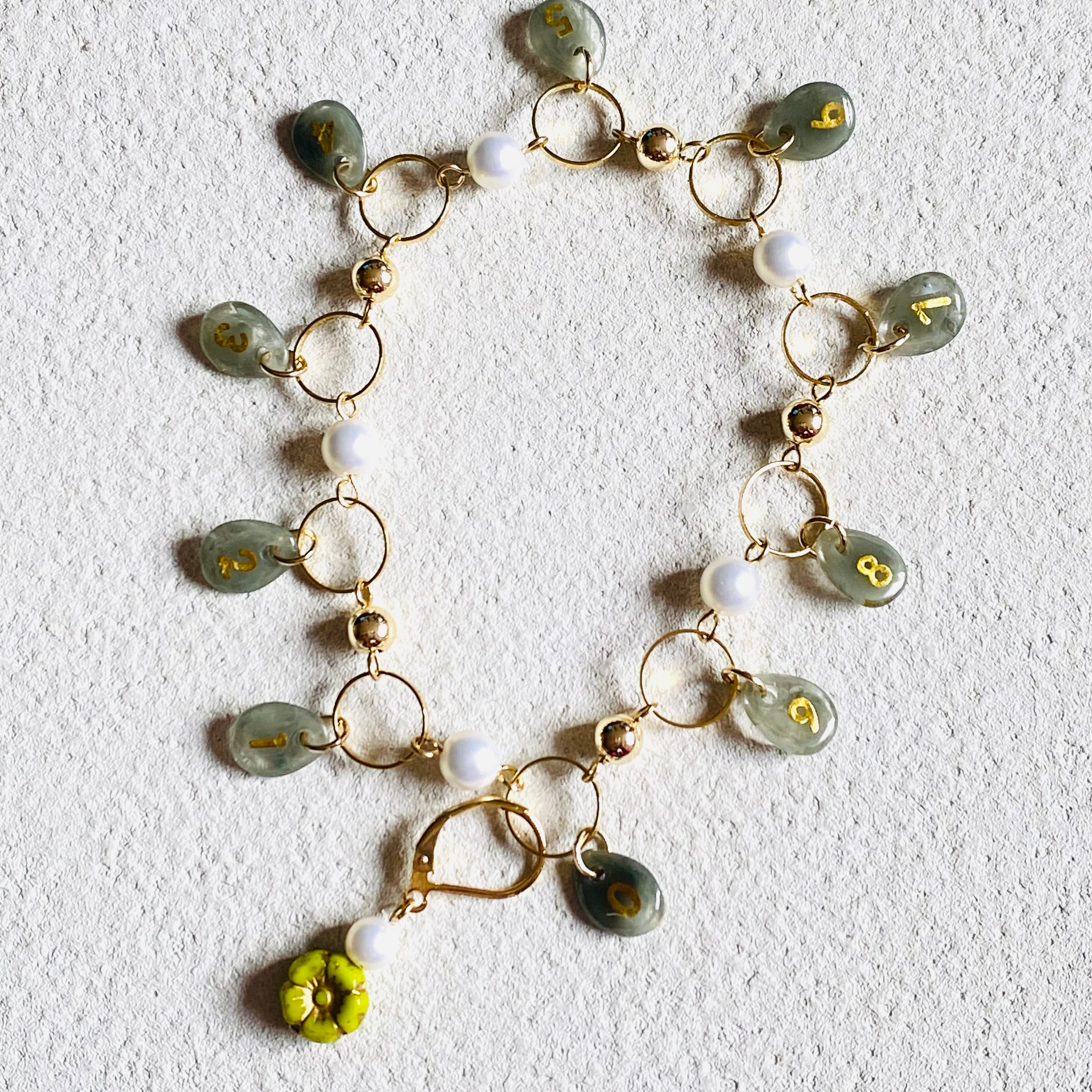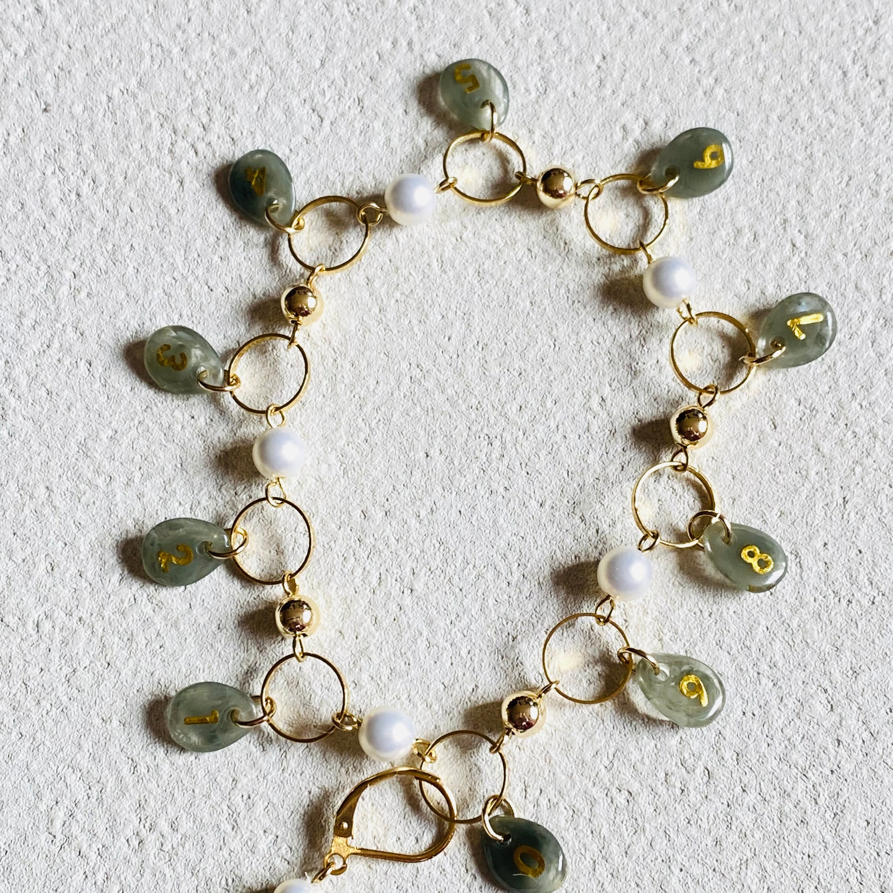 数字のビーズは一つ一つ手作業で数字のシールを貼りレジンコーティングしております。