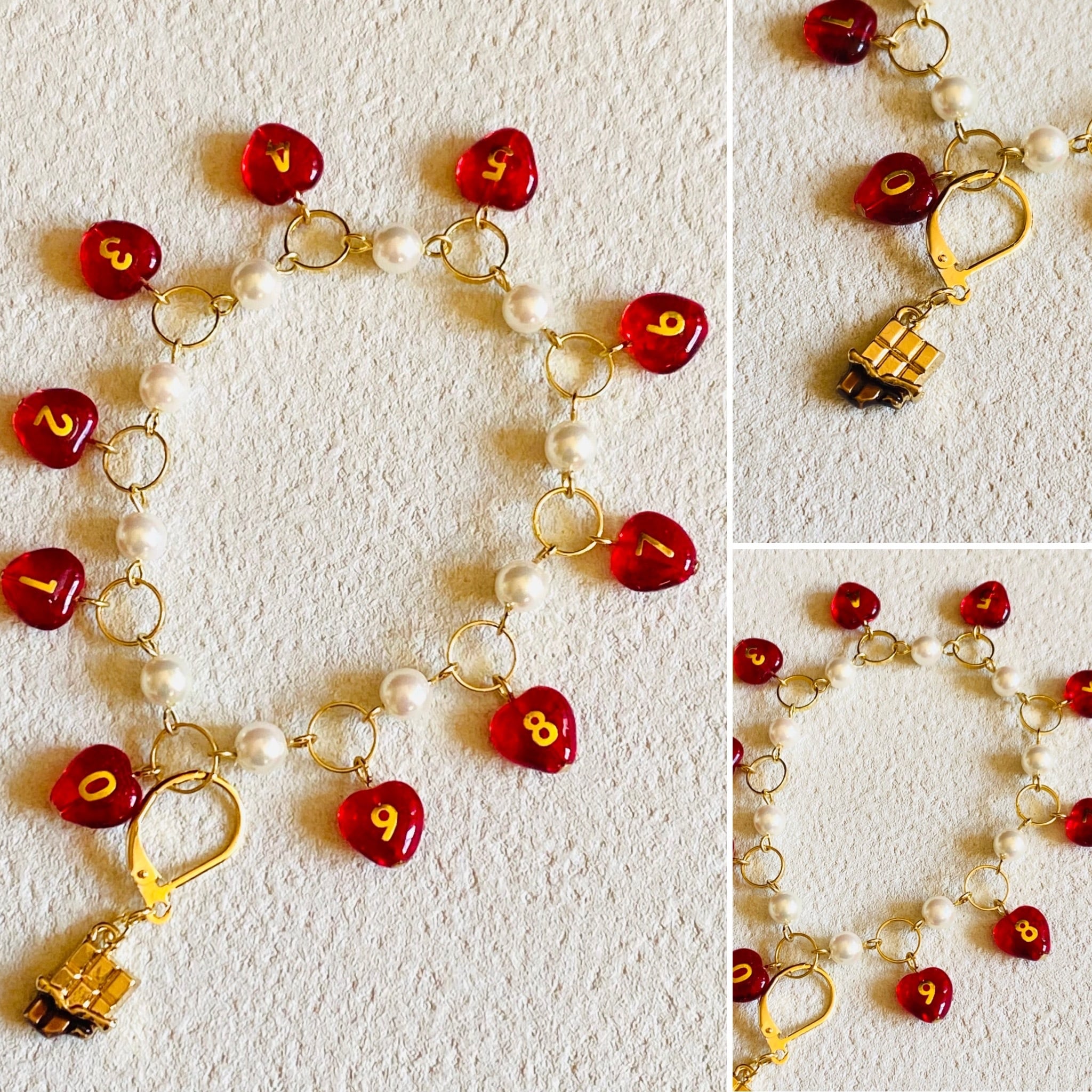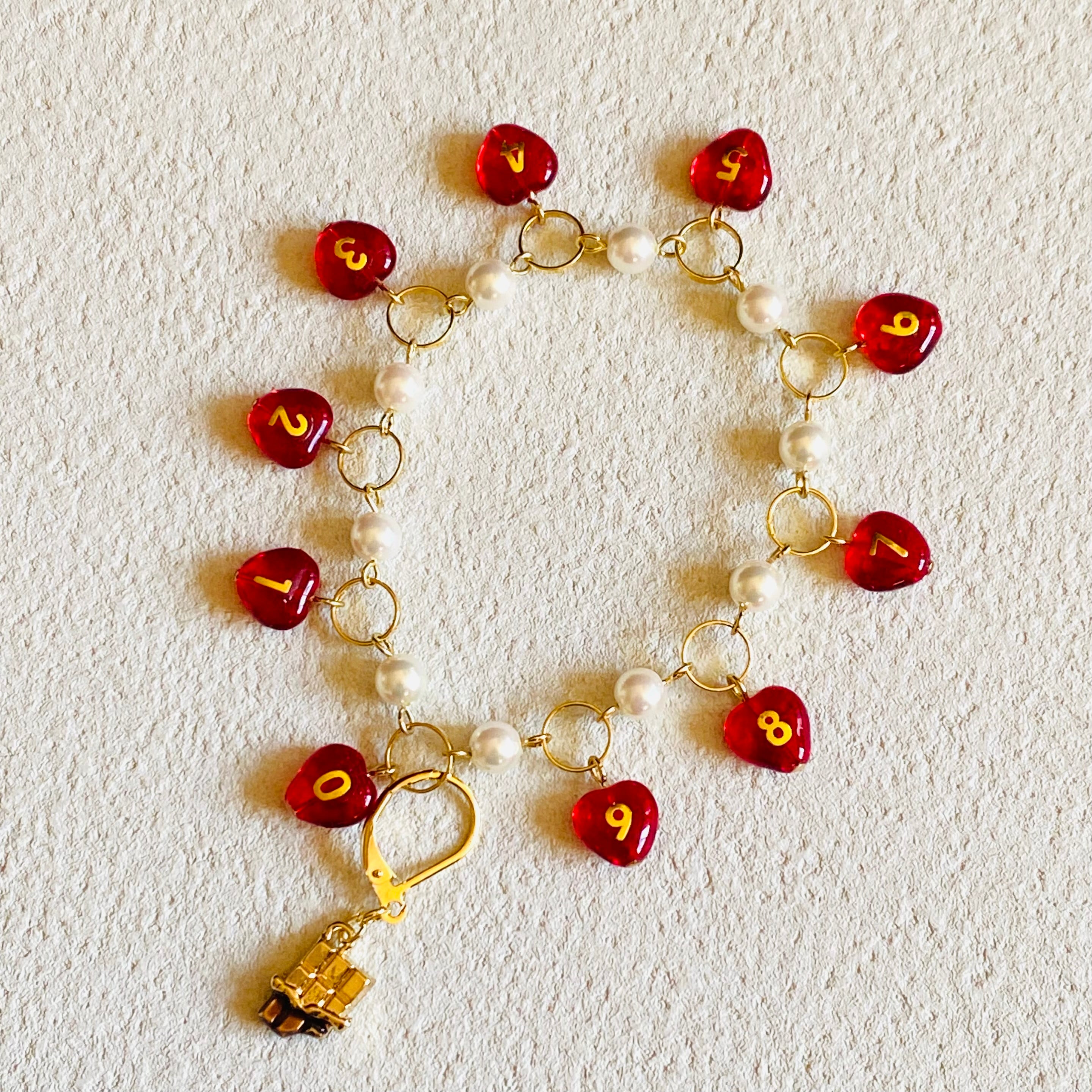 数字のビーズは一つ一つ手作業で数字のシールを貼りレジンコーティングしております。
