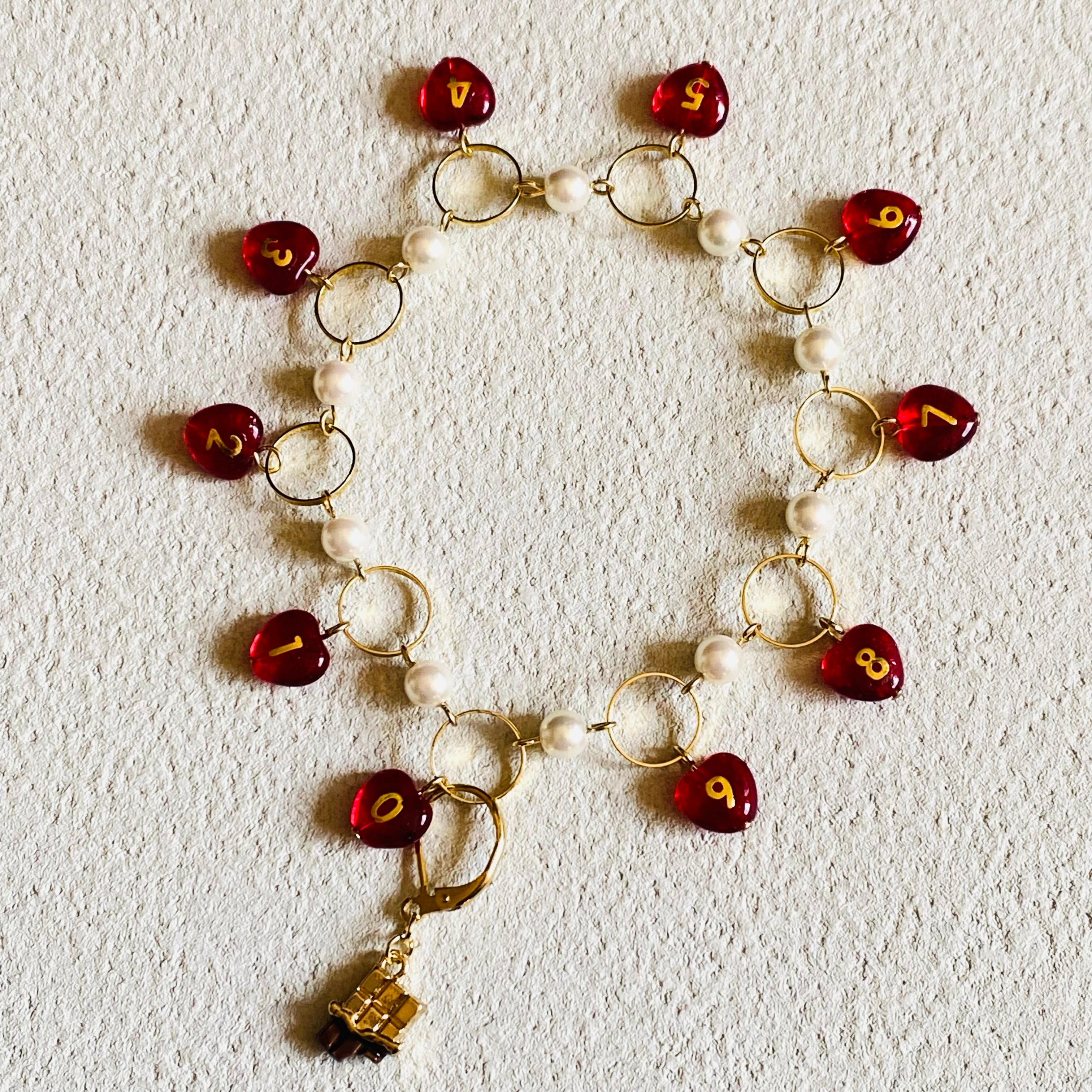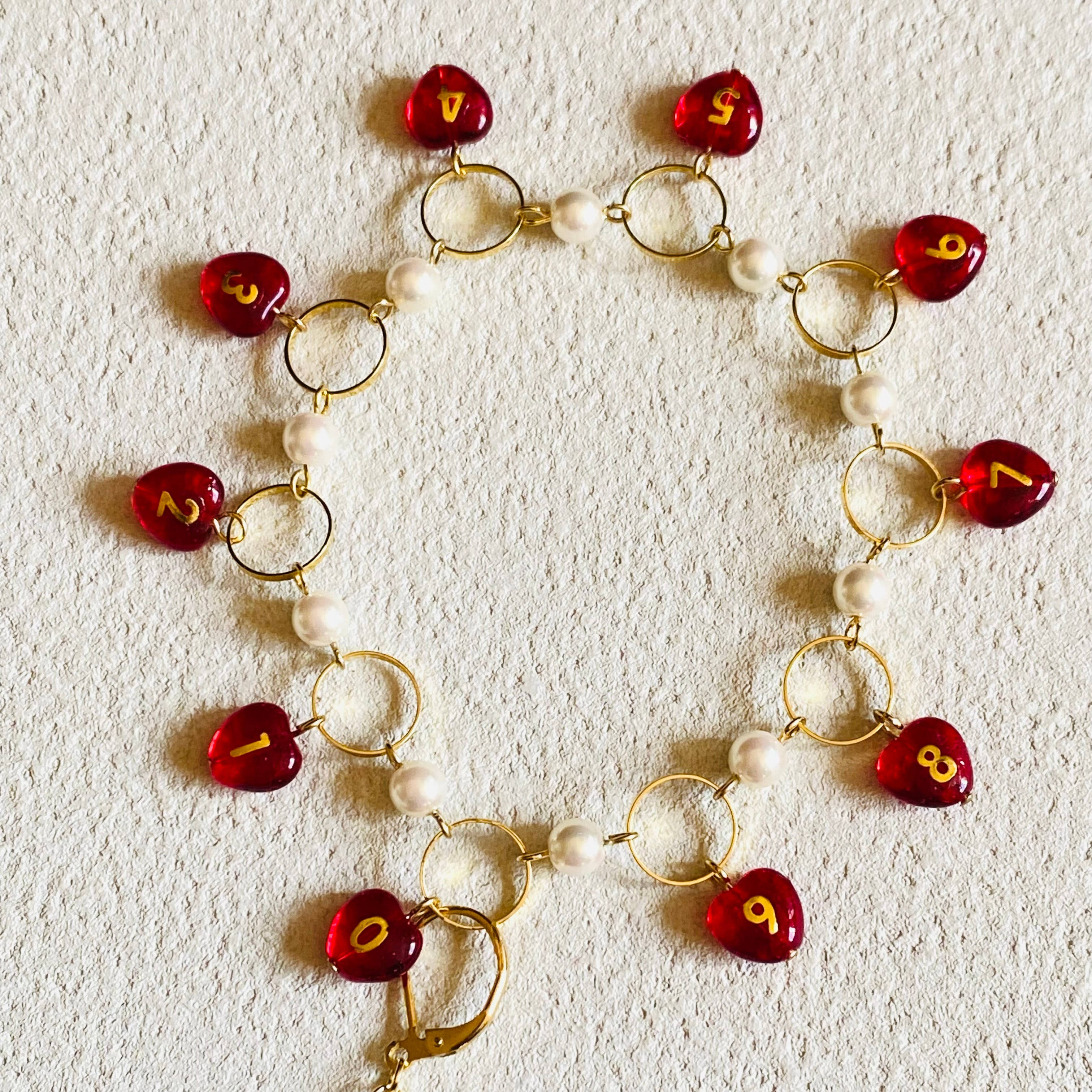 数字のビーズは一つ一つ手作業で数字のシールを貼りレジンコーティングしております。