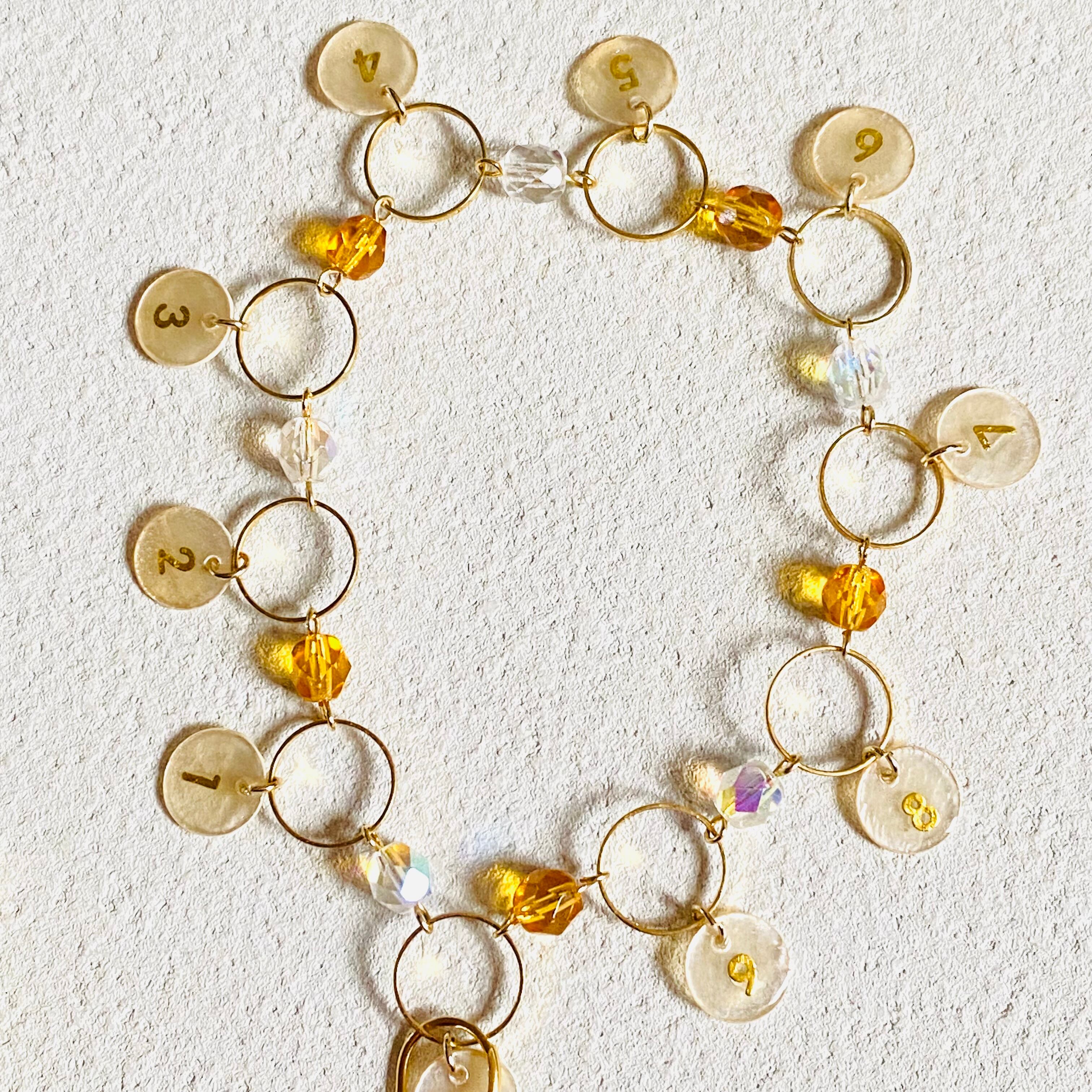 数字のビーズは一つ一つ手作業で数字のシールを貼りレジンコーティングしております。