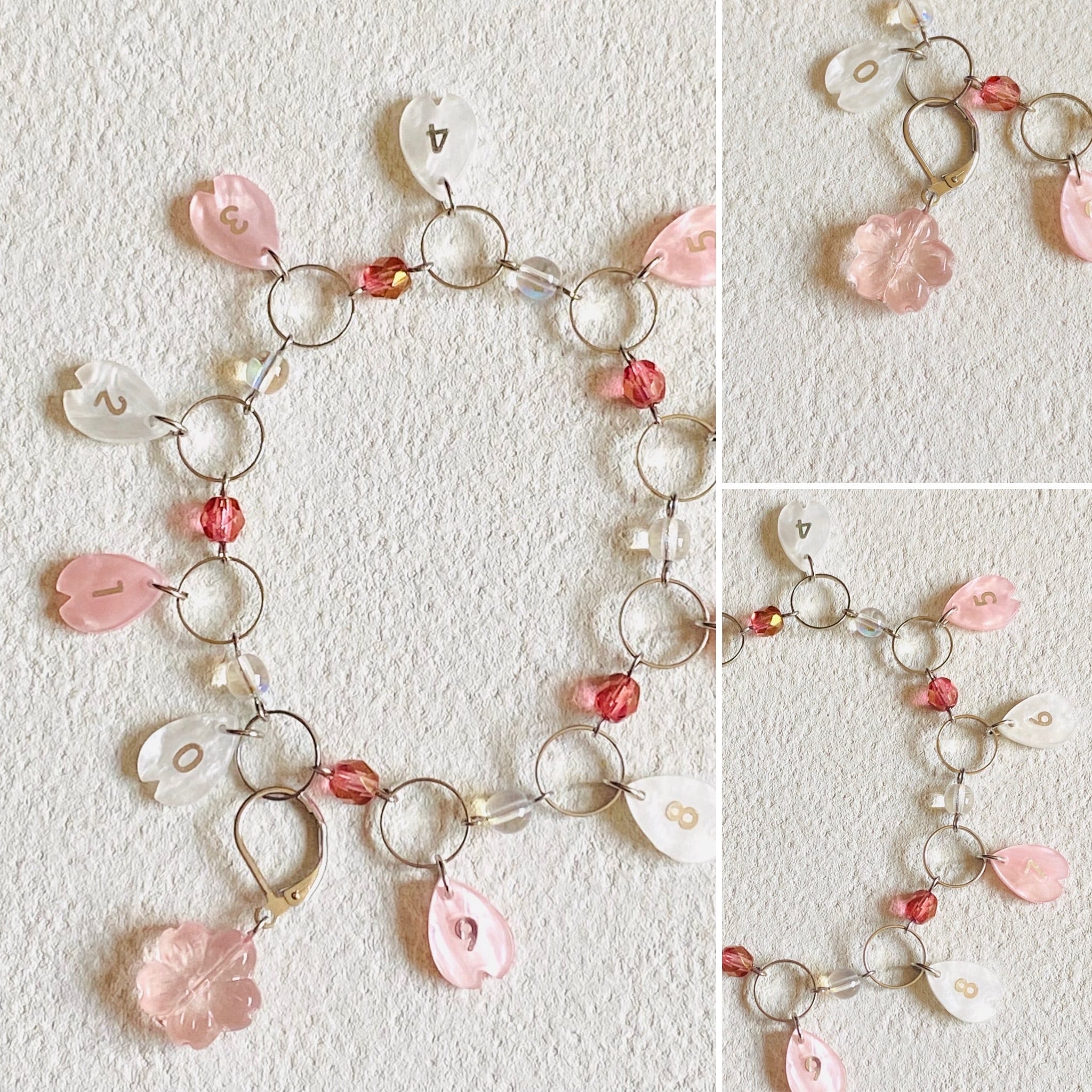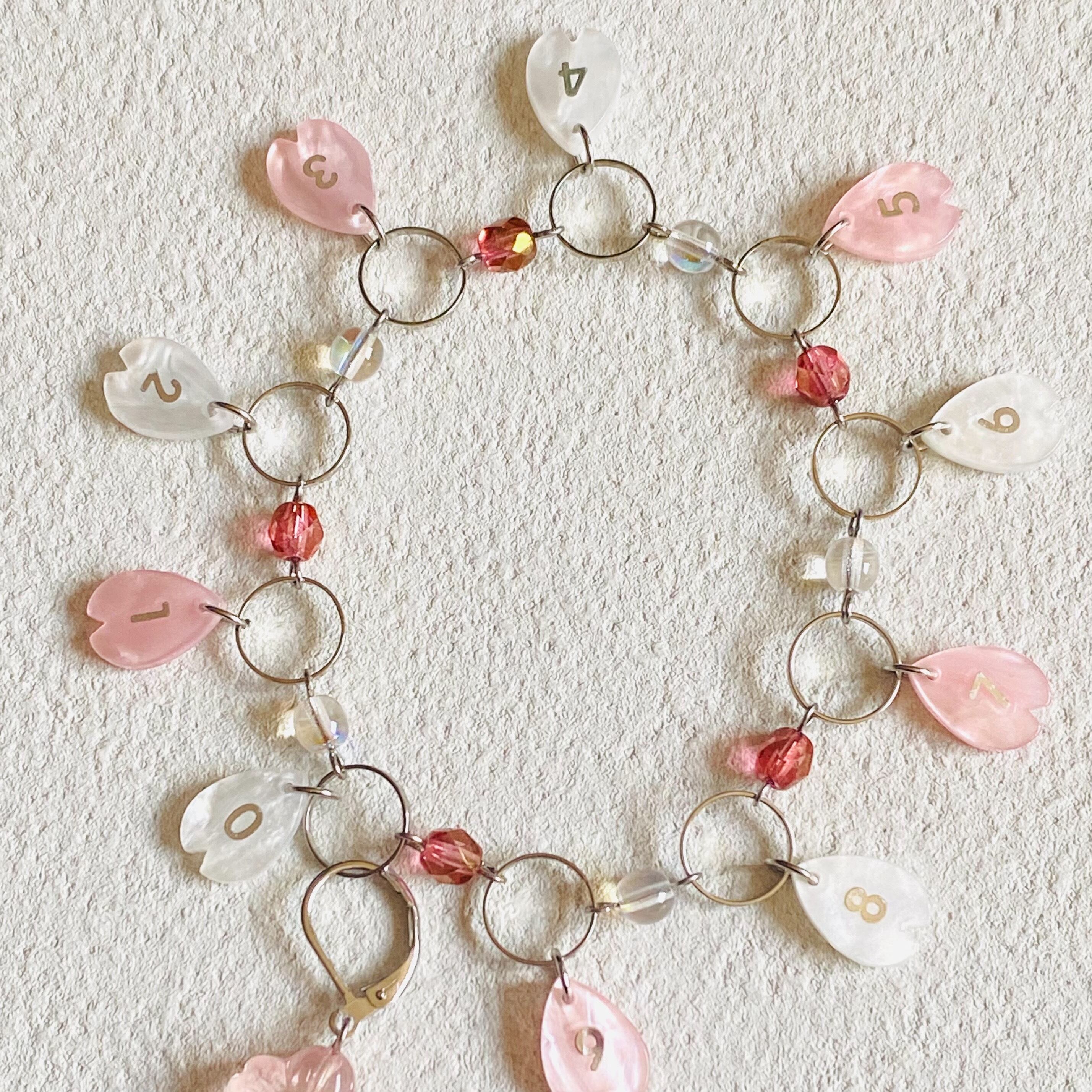 桜の花びらのビーズを数字部分に使い、マーカーも桜のお花のチャームを使った桜づくしの季節感溢れるアイテムです。